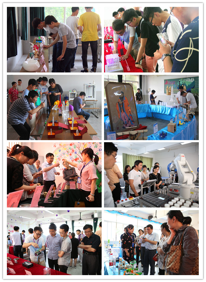 此外,活动现场设置了“创客作品展示”区域,集中展示了近两千件校内外创客作品,作品既有江南网页版师生创新创意作品,又有来自企业的Brookstorn、智能硬件等新奇特产品,同时还吸引了江宁金箔、烙画、方山裱画、剪纸等江宁非遗项目作品参展,另外,现场还有大学生创业项目产品的展销活动。现场也开设了3D打印、激光切割、激光内雕、热转印、无人机、VR、arduino、乐高机器人、智能家居、系统集成、软件设计、艺术设计、陶艺等15个创客工坊体验,由创客导师现场操作演示,指导校内外创客体验新科技。而以表演赛形式呈现的“2对2足球机器人”竞赛、“马球机器人”等新式运动,给校内外创客们带来充满活力与智慧的体验。