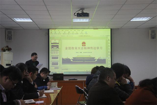 会上,学校纪委书记、副院长陈赵传达并解读了习近平总书记在全国教育大会上的重要讲话精神。她指出,我们要深刻领会习近平总书记提出的“九个坚持”,“六个下功夫”和“七个教育引导”等新理念,为我们做好教育教学工作提供了基本遵循,具有重大的指导意义和现实意义,我们要切实把思想和行动统一到党中央重大决策部署上来,不断开创新时代学院教育事业发展新局面。陈院长要求以支部为单位,组织全体教职员工学习习近平总书记重要讲话原文,理解讲话精神,将全教会精神落到实处。