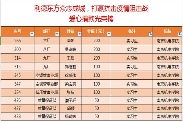 学院机械工程系12名学生在合作实习单位南京利德东方橡塑科技有限公司积极参与捐款。在企业看来他们还只是在校的学生,并不属于这次疫情募捐的所属的单位职工,可当学生们知道单位发起了募捐,都第一时间要求捐款,他们是众多机电学子中有担当、有责任、有爱心的缩影。