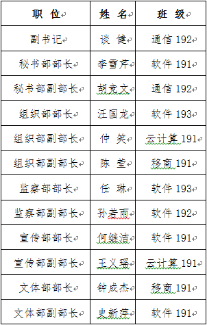 为加强学生干部队伍建设,本着“公平,公正,公开”的原则,根据《信息工程系团总支规章》第八章换届选举的文件精神,经过学生自主报名、资格审查、竞选答辩、综合考察等环节,最终确定信息工程系团总支干部人选,现公布如下: