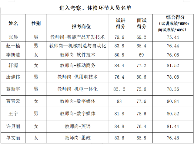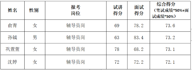 根据《江南网页版2020年教师、辅导员公开招聘笔试、试讲及面试考核公告》,经过资格审查和考核等环节,并经学院公开招聘领导小组和党委会研究,现将各招聘岗位进入考察、体检环节的人员名单予以公示,公示时间为五个工作日(2020年8月17日—2020年8月21日)。如有异议请在公示期内向我院人事处或纪委办公室反映。