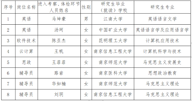 根据《江南网页版2020年度教师及辅导员补充招聘公告》,经过资格审查和考核等环节,并经学院公开招聘领导小组和党委会研究,现将各招聘岗位进入考察、体检环节的人员名单予以公告。