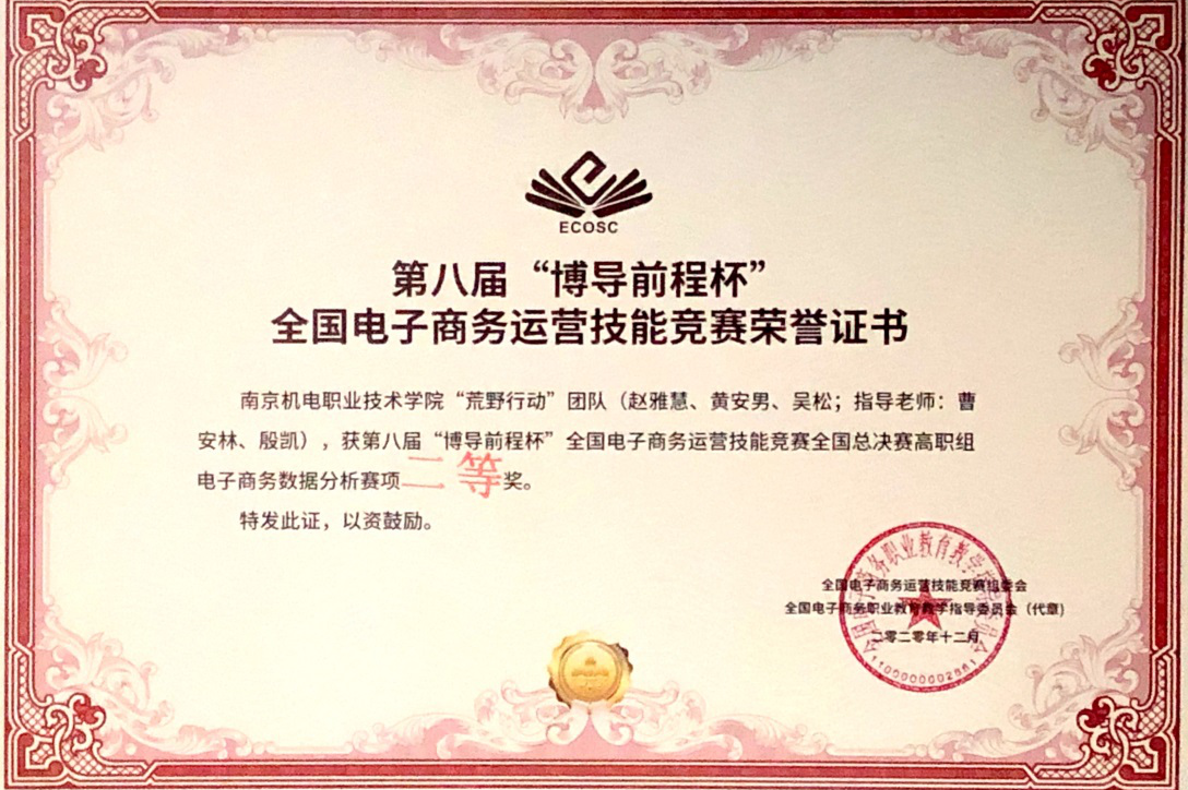 2020年12月29日,第八届“博导前程杯”全国电子商务运营竞赛决赛在苏州经贸职业技术学院举行。江南网页版电子商务运营“超级飞侠队”团队(骆兴雅、卢鹏程、颜颖;指导老师:施炜、陈洁)以及电子商务数据分析“荒野行动队”团队(赵雅慧、吴松、黄安男;指导老师:殷凯、曹安林)双双荣获高职组全国总决赛二等奖。