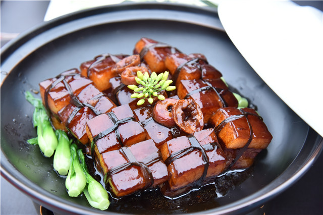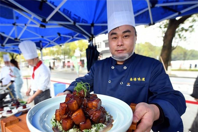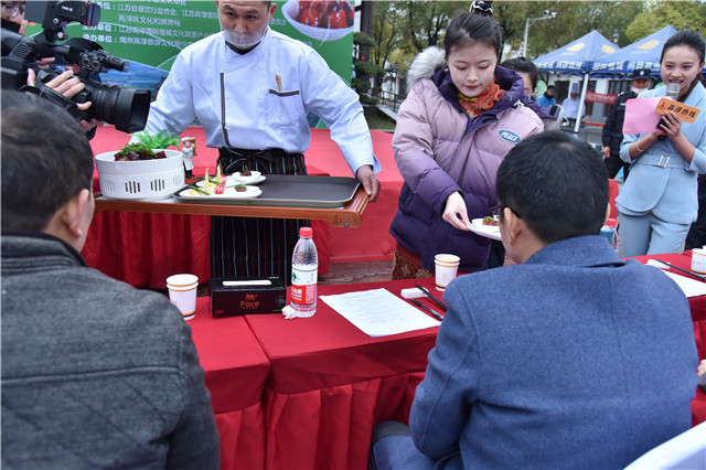 为保证此次大赛的公平公正,五位评委将从菜品的色、香、味、形、质感等全方面进行点评和评选。我校礼仪社的同学为评委递上参赛选手精心制作的美味菜肴,一份份精美的红烧肉像一件件艺术品被搬上评委席。