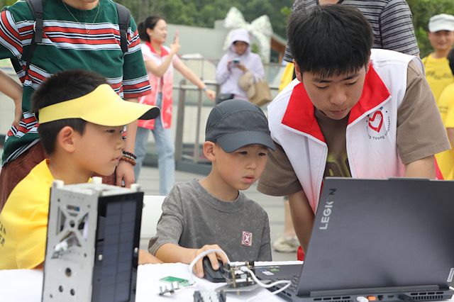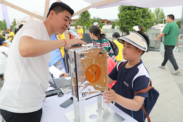“‘南京号’星耀科普行”团队同样备受关注。他们携带学校研发的卫星模型,向游客普及航天知识,并邀请青年参与编程体验。这一创新性的科普活动不仅激发了青少年对科学的兴趣,也展现了学校在科技创新和科普教育方面的成果。