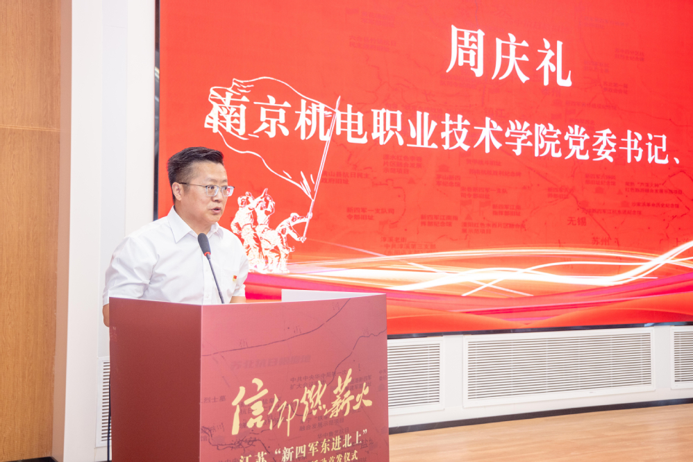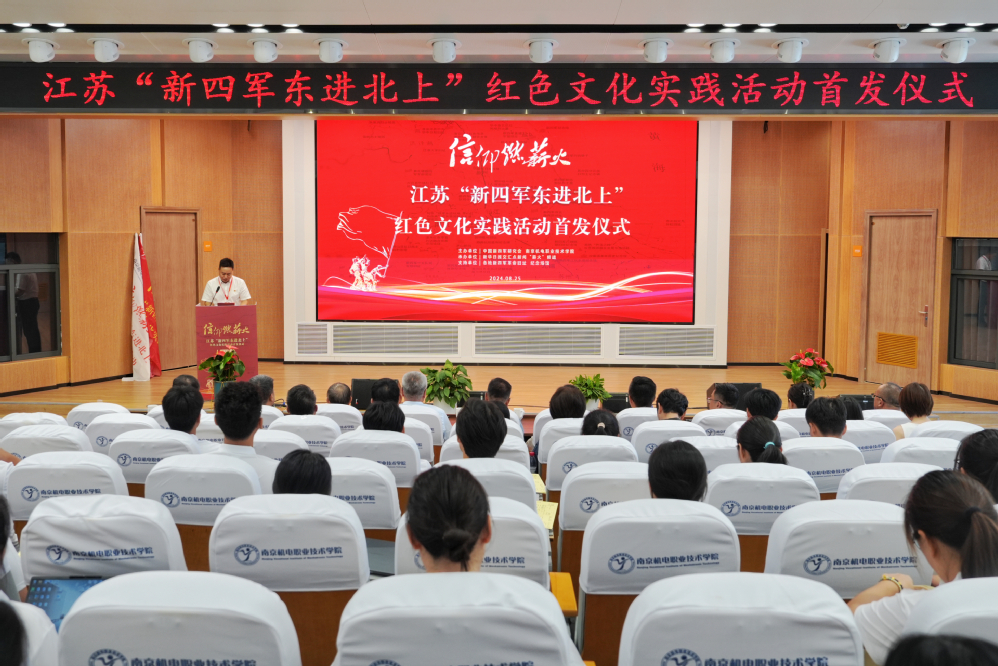 8月25日,我校在乐学楼报告厅举办了江苏“新四军东进北上”红色文化实践活动首发仪式。中国新四军研究会副会长刘春灏,中国新四军研究会学术委员会主任常浩如,中共江苏省委党史工作办公室副主任吴逵隆,新华日报社党委委员、副总编辑钱丽萍,中共江苏省委宣传部宣教处处长张广宇,江苏省文化和旅游厅革命文物处处长刘旭东,江苏省退役军人事务厅拥军褒扬处处长张苇苇,江苏省档案馆资源开发处副处长朱芳芳,南京理工大学马克思主义学院党委副书记、纪委书记徐彦秋,江苏省文化艺术科学技术协会副秘书长夏军,茅山新四军纪念馆副馆长杨玉秀,新四军江南指挥部纪念馆行政部副主任刘亚平,江南网页版党委书记、校长周庆礼,党委副书记、副校长赵学洪,纪委副书记、纪委办公室主任周启国出席,我校思政中心教师、网络思政中心站长和“三下乡”大学生社会实践团铁军训练营师生参加。仪式由江南网页版党委委员、副校长孔德丽主持。