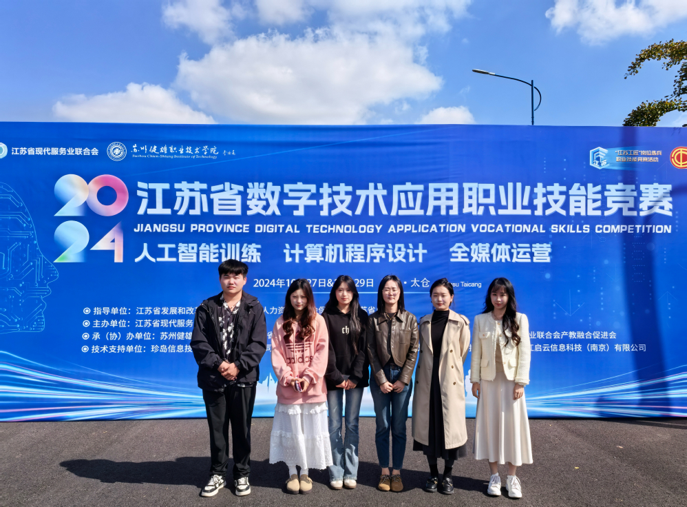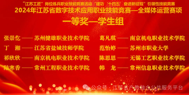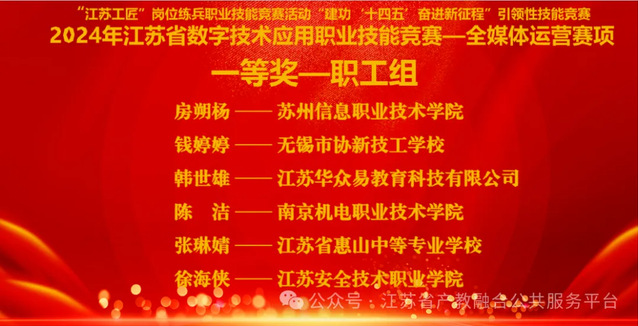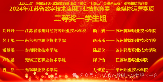 2024年10月29日,由江苏省人力资源和社会保障厅举办的“江苏工匠”岗位练兵职业技能竞赛活动——2024年江苏省数字技术应用职业技能竞赛“全媒体运营”赛项全省总决赛在苏州健雄职业技术学院举行。我校信息工程系移动商务专业陈洁老师获得职工组一等奖,陈珑丹、施炜老师获得职工组二等奖;23级移动商务231班葛凡琪、祁欣欣获学生组一等奖,232班吴上垠获学生组二等奖。