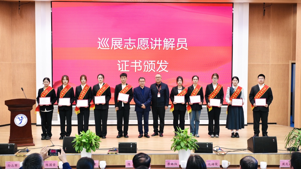 晴日朗朗,迎着晨光,一块块展板前,充满朝气的“小铁钉”志愿宣讲员们已开始“上岗”前的演练,每四位同学为一小组,负责一个专题板块的研究与宣讲。校纪委、宣传等部门在开展前就进行了宣讲员的公开招募与选拔,24个“小铁钉”多为大一新生,正值和新四军战士同样的青春年华,在茅山新四军纪念馆的支持和辅导下,他们认真研读、背诵、宣讲巡展内容,去亲近八十多年前那群同龄人们“不怕困难、不畏艰险,勇于斗争、敢于胜利”的精神世界。“愿这次展览能在你们心中播下红色的种子,激励你们不断前行,以精湛的技艺和坚定的信念,为祖国的繁荣、富强作出更大的贡献!”茅山新四军纪念馆孙志军馆长在开展仪式中勉励同学们。周再兴副馆长与学校党委副书记、副校长赵学洪为“小铁钉”们颁发荣誉证书。
