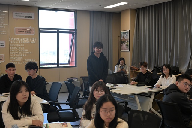 11月12日下午,詹娜·列奥诺娃校长一行首先在学校中俄教育中心与俄语班学生召开了座谈会。我校学生为詹娜·列奥诺娃校长一行精心准备了俄语版诗歌《假如生活欺骗了你》的朗诵表演。座谈会上,同学们积极发言,就俄罗斯传统文化、国立人文社会大学的情况、后期的交流学习等方面提出了疑问。詹娜·列奥诺娃校长非常热情地就学生们提出的问题一一进行了回应和解答。她表示,学生们的诗歌朗诵让她非常感动,此次的座谈会是一次很好的机会,让她可以面对面与学生沟通,了解到我校学生的实际需求,也相信同学们能创造更美好的明天。