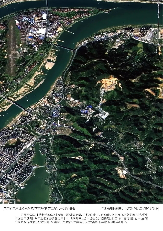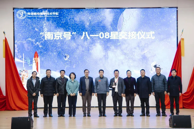 在市委、市政府和上级主管单位的关心支持下,由我校师生牵头研制的“南京号”暨中国青少年科普卫星(八一08星)成功进入预定轨道。2024 年 1 月 17 日,该卫星搭乘“天舟七号”货运飞船成功升空,在太空经历长达 303 天的在轨存储后,于 11 月 16 日成功释放入轨,开启了独立探索太空,执行科普教育和科学研究任务的旅程。执行科普教育的使命。11 月 17 日,卫星顺利拍摄并传回首张遥感照片,照片的清晰度令人振奋。12 月 12日,“创新赋能未来,技能塑造人生”——航天特色教育创新引领行动暨“南京号”八一08星交接仪式在我校顺利举行,“南京号”八一 08 星正式由中国航天科技集团相关部门交接至我校,成为学校航天工匠人才培养创新实践的首个里程碑。