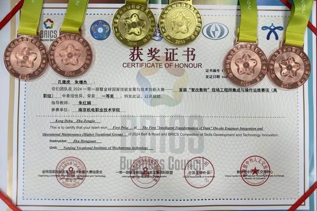 近日,2024“一带一路”暨金砖国家技能发展与技术创新大赛首届“智改数转”现场工程师集成与操作运维赛项全国决赛圆满收官。我校自动化工程系2023级学生朱增杰、孔德虎团队在朱红娟老师的指导下斩获一等奖,指导教师朱红娟获评优秀指导教师,学校获最佳组织奖。