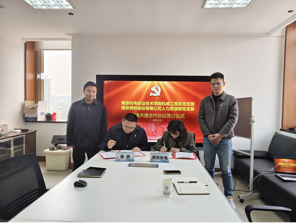 为深化推进学院党建+产教融合工作模式,在南京机电-南钢现场工程师项目的基础上,校企双方进一步加强交流合作。机械工程系党支部与南京钢铁股份有限公司人力资源部党支部在南钢集团人力资源部签署了党建共建协议,为培养高素质技术技能人才探索创新性培养模式,同时推动地方高端装备制造业发展。