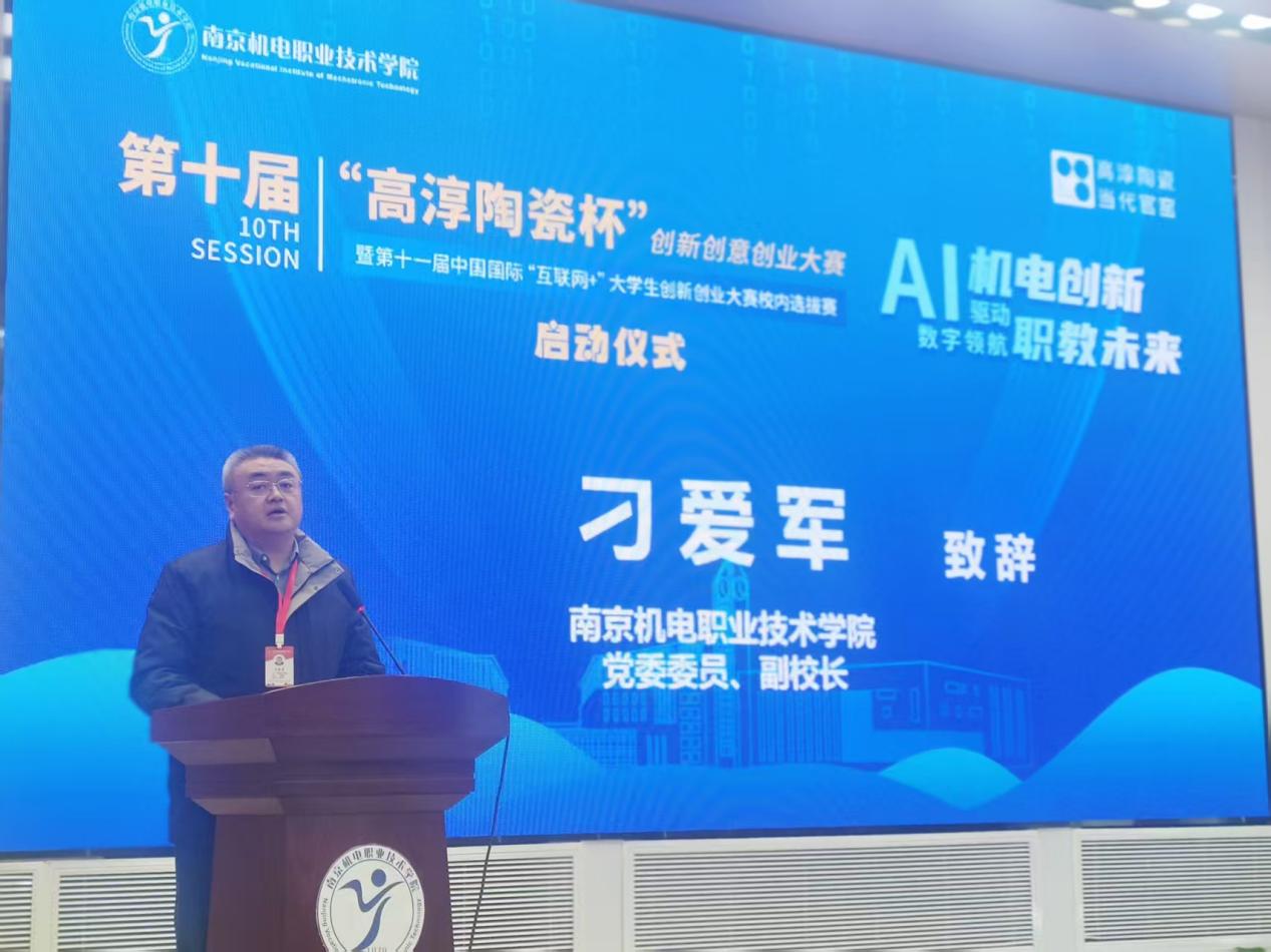 2025年3月18日,“AI驱动机电创新,数字领航职教未来”江南网页版第十届“高淳陶瓷杯”创新创意创业大赛暨第十一届中国国际“互联网+”大学生创新创业大赛校内选拔赛启动仪式在乐学楼102报告厅举行。南京市高淳区科技局局长、科协主席马启顺,南京高淳高新技术产业开发区管理办公室分管负责人倪友谊,南京高等职业教育创新创业园发展服务中心主任吴凯,江苏高淳陶瓷股份有限公司党委副书记、副总经理周玉明,学校党委委员、副校长刁爱军等领导出席启动仪式。300余名师生代表参加活动,共同见证大赛开幕。