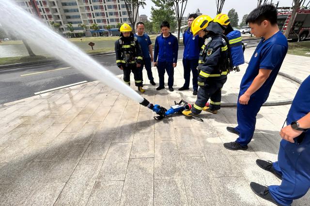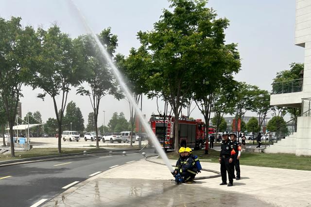 消防站救援队对室外消防接合器、室外消火栓等设施进行了常规检查。在灭火演练中,消防救援队快速铺设水带,架设高压水枪灭火,展示了娴熟的消防技能,提升了安保人员初期火灾处置能力。