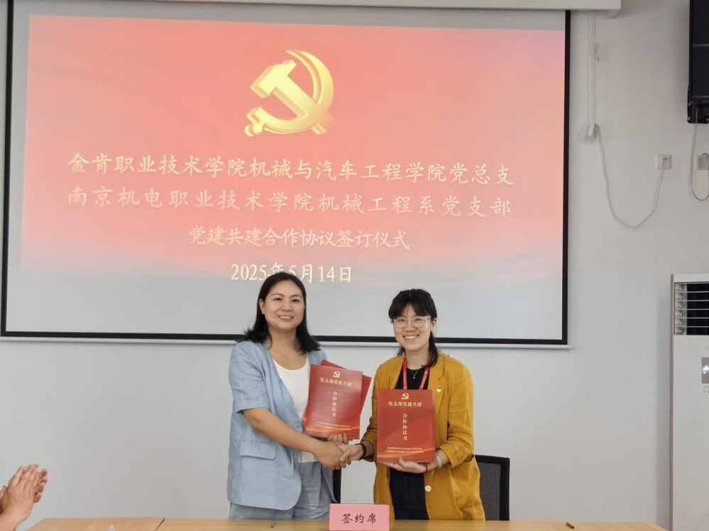 胡枫与周秀珍分别代表机械工程系党支部与金肯职业技术学院机械与汽车工程学院党总支签订了党建共建协议,充分发挥党建引领作用,构建资源共享、优势互补的协同发展机制。