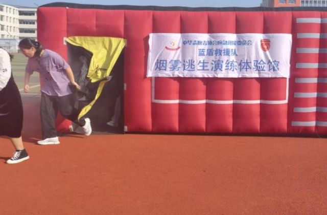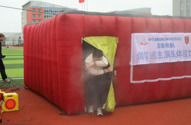 第三部分为模拟火灾逃生体验。演练场地设立模拟火灾逃生体验帐篷,组织新生有序通过黑暗、有浓烟的模拟火灾逃生帐篷。