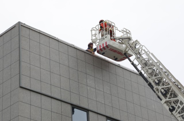 第二环节是高淳区消防救援大队进行楼宇人员被困高空救援展示,模拟学校青春剧场人员被困,消防救援大队启动高空救援车辆进行营救。