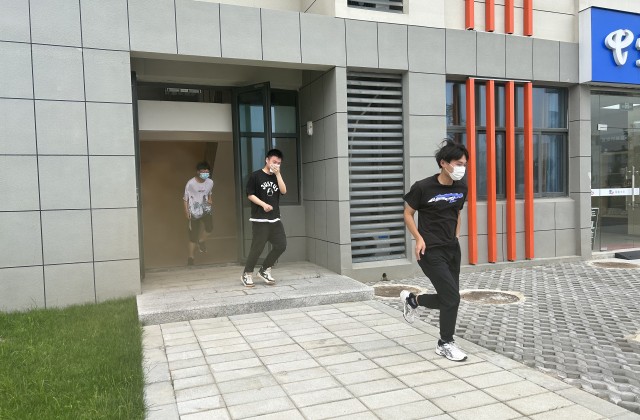 本次演练共分为三个环节,第一个环节是疏散逃生演练。疏散逃生演练是以博雅苑某宿舍电器故障起火为背景,模拟制造“火灾现场”,楼内消防报警设备发出报警信号,火警确认后由总指挥启动应急疏散命令,消控室值班人员立即启动消防应急疏散广播及排烟系统,现场工作人员立即引导师生快速疏散。