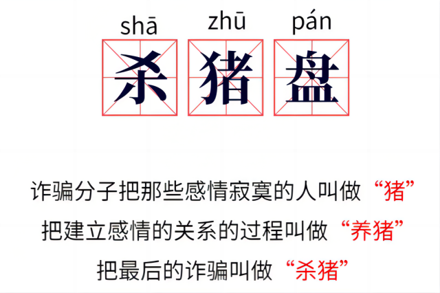 杀猪盘-诈骗:一般指的是通过网上聊天、恋爱交友的方式获取受害者的好感,赢取受害人的信任,然后以一些投资、理财、博彩等平台网站诱导受害人在里面充值转账,前期平台一般可以提现,诱导受害人更大的投注,也就是“养猪”,后期平台网站关闭取现功能,将受害人资金全部卷走,达成“杀猪”目标。