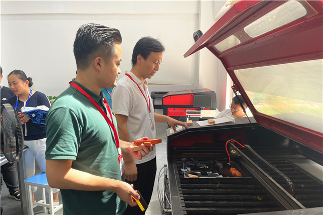 在蓝岛创客空间黄克瑶老师的细致讲解下,全体教师再次认真学习了“红船精神”的历史背景和深刻内涵。随后,黄老师分步骤地教授大家制作“红船”模型。他详细地介绍了每一步制作要领,手把手地演示制作方法,一边做一边教。老师们纷纷尝试在模型上留下“红船精神”的印记,感受方寸间的传统文化魅力。一步步的打磨、激光雕刻、粘贴、固定,经过一个多小时的努力,“红船”终于制作完成,老师们手捧亲手制作的“红船”十分有成就感。