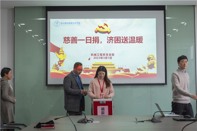 为积极响应南京市政府提出的“慈善一日捐,济困送温暖”号召,3月1日12:30,机械工程系党支部全体教职工积极捐款,支持扶贫济困。活动中,教职工慷慨解囊,用实际行动诠释了扶贫济困、乐善好施的传统美德,为扶贫事业贡献自己的一片爱心。