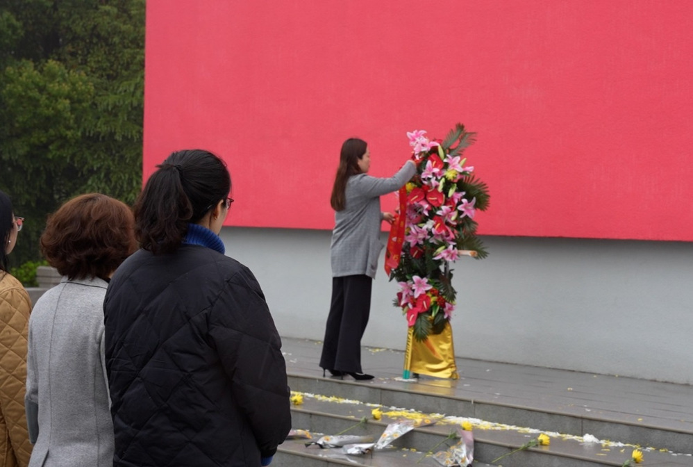仪式伊始,两位党员代表缓缓走上前,将盛满鲜花的花篮敬献在烈士纪念碑前,学校党委委员、纪委书记姜振宇上前整理挽联。随后,在肃静的氛围中,全体人员向烈士默哀,表达对先烈的深切哀思和崇高敬意。默哀过后,重温入党和入团誓词,铿锵有力的誓言在陵园上空回荡。
