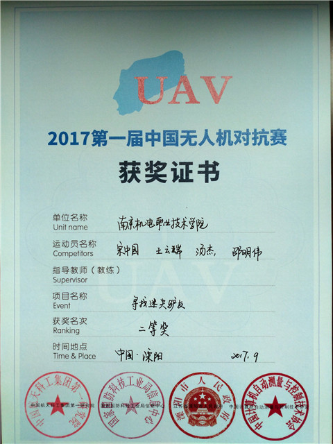 923日,首届中国低空安全科技节综合主题活动暨第一届中国无人机对抗赛在江苏省溧阳市隆重举行, 来自北京航空航天大学、上海交通大学等高校和全国各地无人机企业的80多支代表队参加了此次活动,我院无人机社团参加了本次比赛,并在比赛中喜获三个单项二等奖和三个单项三等奖。