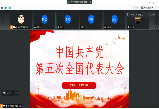 在本次学习中,李老师介绍了中国共产党第五次全国代表大会召开的历史背景、过程、大会的历史贡献、意义、不足之处等。中国共产党第五次全国代表大会于1927年4月27日至5月9日在武昌高等师范第一附属小召开。大会是在大革命面临严重危机的紧急关头中国共产党在共产国际指导下召开的一次党的重要会议,是处在幼年时期的中国共产党探索中国革命道路艰难历程中的一个重要环节。这次大会探讨了中国革命的一系列基本问题,提出了指导中国革命的一些正确原则,为党的思想理论建设作出了积极贡献;大会初步提出了健全党的领导体制和组织系统的一系列举措。