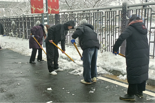 扫雪队成了冬日校园一道独特的风景线。“众人拾柴火焰高”,也就一小时,成果显著。笃行楼、敏行楼和慎行楼中间道路的积雪和冰层全部瓦解,雨雪冲刷之后更显得道路干净。