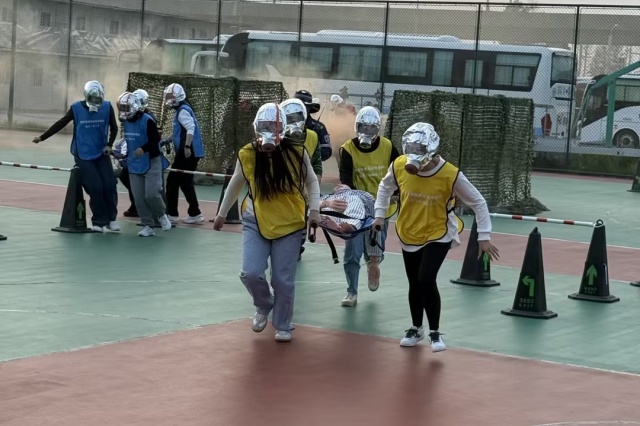 模拟伤员转运和模拟火情处置项目中,电子工程系的教职工们更是将专业技能与团队协作发挥到了极致。他们迅速穿戴消防服、使用灭火器、警戒布控、疏散引导,以及使用担架转运伤员、佩戴防烟面罩穿越障碍,每一个环节都紧张有序,充分展示了电子工程系教职工在应急救援方面的专业素养和团队协作精神。