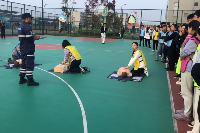 院外急救接力项目更是紧张刺激,心肺复苏、除颤仪使用、就便器材止血和双人徒手搬运等环节依次进行,电子工程系的教职工们凭借专业的急救技能和默契的配合,成功完成了任务,用时极短且操作无误,展现了他们出色的应急救援能力。