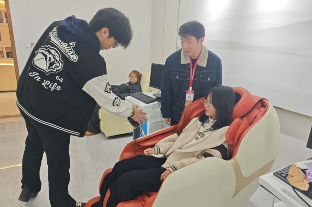 随后,禹花宁带领同学们在学校大学生健康成长中心功能室开展了团辅活动。目前学校大学生健康成长中心主要设有预约接待室、自主调节室、个体咨询室、团体辅导室、音乐放松室、沙盘游戏室等多间不同功能的房间。活动过程中,大学生健康成长中心值班人员向同学们重点介绍了功能室心理自助成长、心理测评、心理咨询、正念冥想、情绪宣泄、VR认知训练、放松训练、团体活动、自主调节等各个方面功能并进行实操演示和体验学习,为师生提供了全方位的心理健康服务。