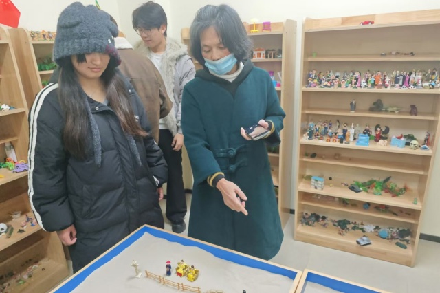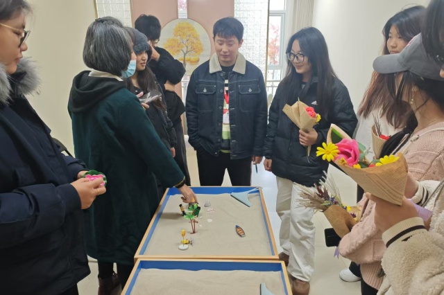 在沙盘游戏室中,大学生健康成长中心老师周雅萍亲自与同学们互动,以沙盘游戏的方式呈现学生们内心的心理情境,通过游戏寻找同学们的心理问题和原因,进而帮助学生了解内心情感与情绪的真实状况。活动最后,禹花宁鼓励学生心理骨干们今后多利用这些资源,为同学们提供更加专业、有效的心理支持。