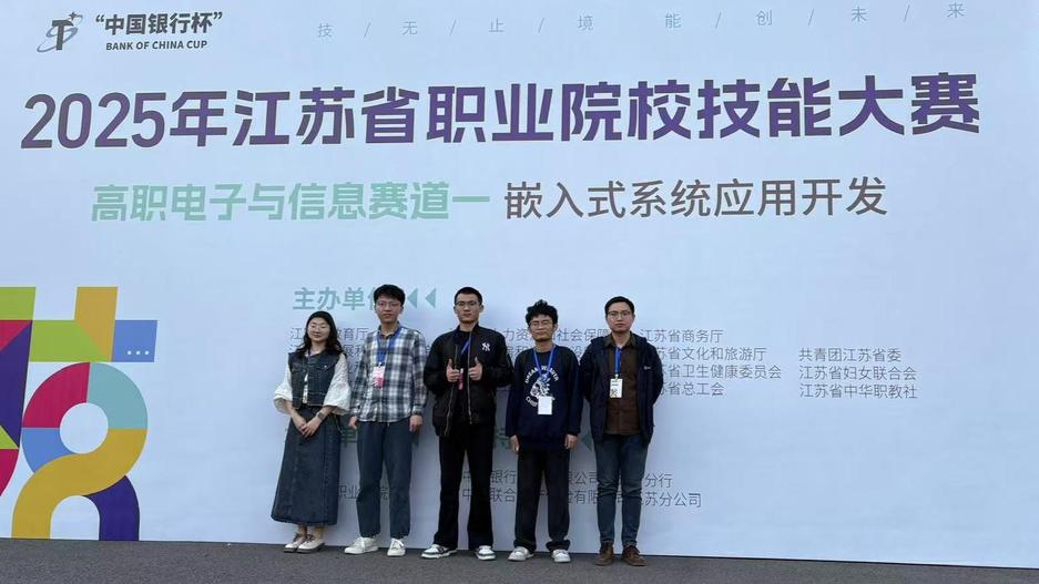 4月8日至10日,2025年“中国银行杯”江苏省职业院校技能竞赛“嵌入式系统应用开发”赛项在无锡科技职业学院举行。经过激烈角逐,我系智能产品开发与应用专业张晨、倪帆老师指导的学生团队解德斌、潘子扬、孙伟杰荣获学生组二等奖,在全省33所职业院校队伍中排名第五。