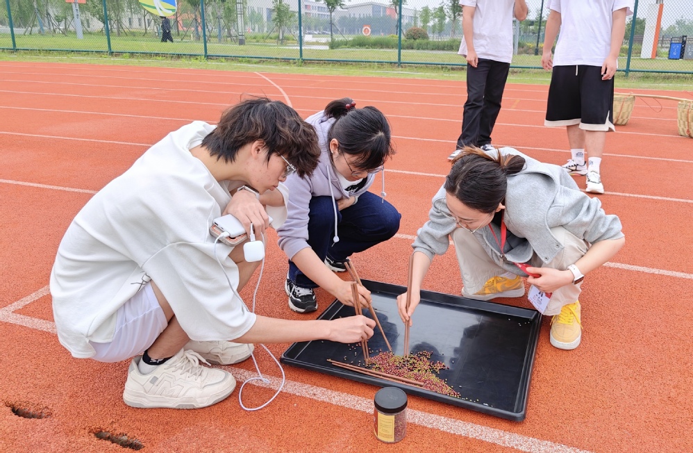 在“急速搬运工——农田物资接力赛”中,师生们肩挑扁担,跨越障碍物,接力运送“粮食”。这不仅仅是一场速度与力量的较量,更是对团队抗压协作能力的极致考验。在“精准投喂——果园采摘大作战”环节,充满了欢声笑语,师生们站在指定区域外,专注地将“水果”投向背篓,每一次成功的投递都伴随着阵阵掌声与欢呼。同时,环保热点也被巧妙融入到了“争分夺秒——垃圾分类赛”中,师生们快速抽取垃圾卡片、准确分类投放,每一次正确的选择都是对环保理念的践行,每一次迅速的决策都是对自我能力的挑战。