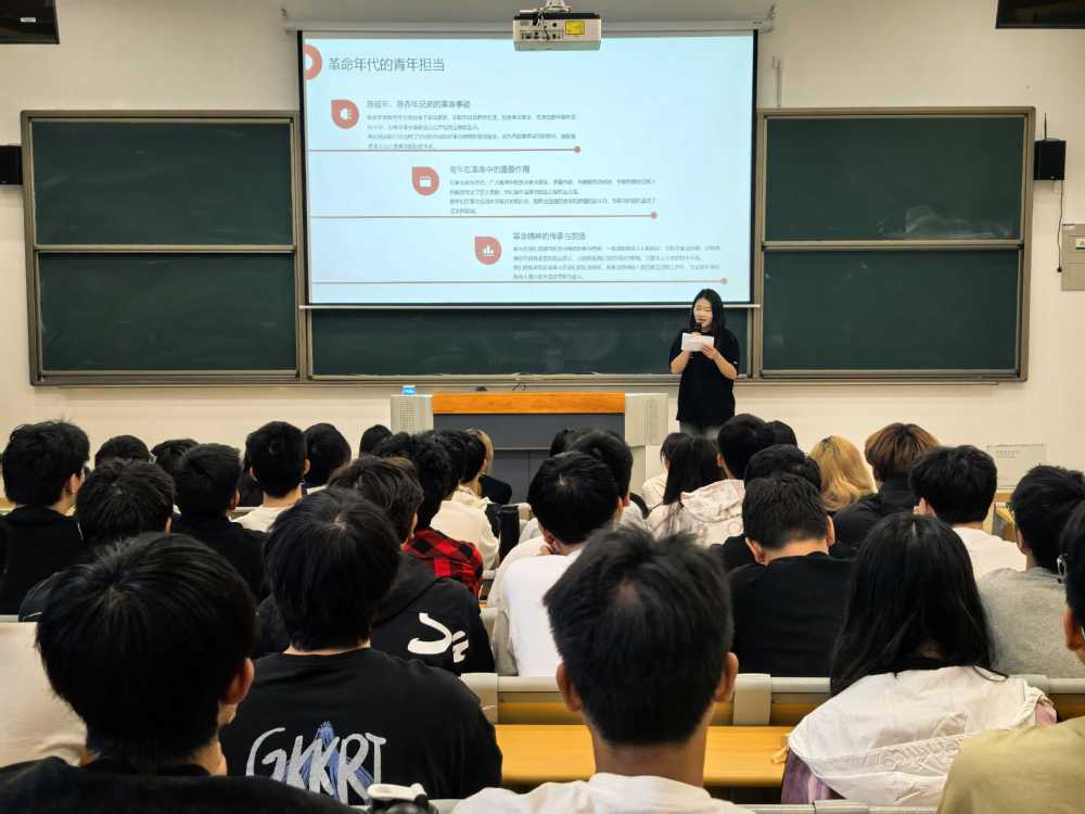 在主题团课分享环节,何智思同学围绕“五四精神:中国青年的责任与担当”展开分享,将革命先烈的精神品质与当代青年的使命相结合,号召同学们既要仰望星空,更要脚踏实地。唐乐怡同学则以“秉承民族使命,照破山河万里”为题,从五四运动中青年们为国家独立、民族解放而英勇奋斗,深情讲述了陈乔年等革命烈士的感人事迹,生动诠释了五四精神的时代价值。