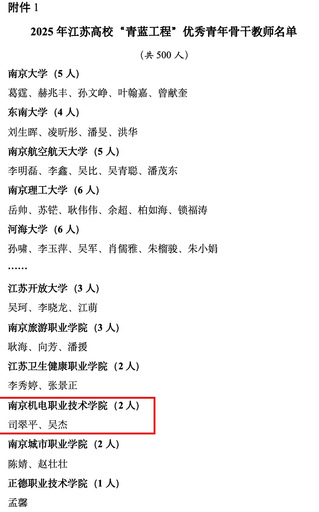 近日,根据江苏省教育人才队伍建设年度计划,经各高校推荐,省教育厅组织专家遴选,我校电子工程系李俊娇老师成功入选2025年江苏高校“青蓝工程”中青年学术带头人培养对象,司翠平老师成功入选2025年江苏高校“青蓝工程”优秀青年骨干教师培养对象。