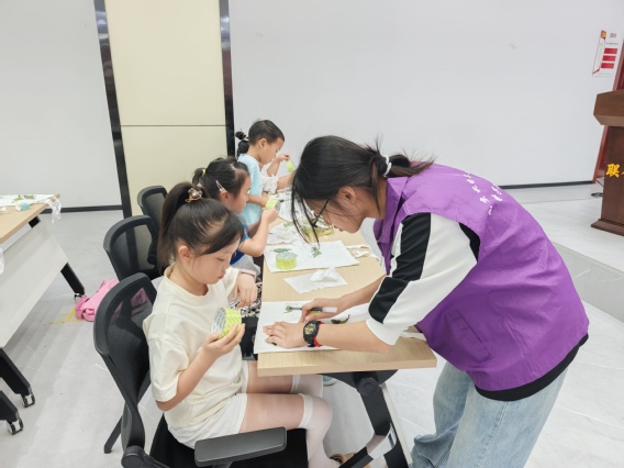 上午场,大学生志愿者们来到古柏街道新城社区。在这里,他们带领孩子们开启了一场传统与创意交织的拓印之旅。志愿者详细地给孩子们讲解拓印的历史、原理和方法,孩子们听得津津有味,眼中满是好奇与期待。在实践环节,孩子们精心挑选自己喜爱的树叶,小心翼翼地将其放在帆布包上,然后用颜料、小刷子等工具,认真地进行拓印。不一会儿,一幅幅充满童趣的树叶拓印帆布包就诞生了,孩子们看着自己的作品,脸上洋溢着自豪的笑容。