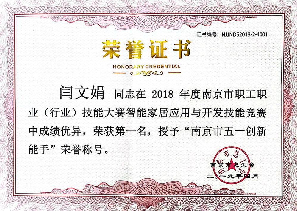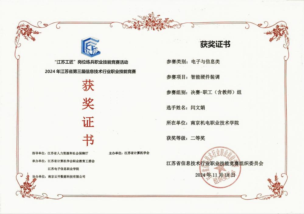 闫文娟,女,硕士,副教授,专业负责人,南京市技术能手,南京市五一创新能手,市级“物联网应用技术”高水平专业群负责人,获得省级教师组技能大赛二等奖2次,三等奖1次;指导学生获得技能竞赛省级一等奖2次,二等奖6次,三等奖15次;主持纵横向科研课题5项,发表论文16篇,其中核心2篇,专利授权9项,主编教材2本。