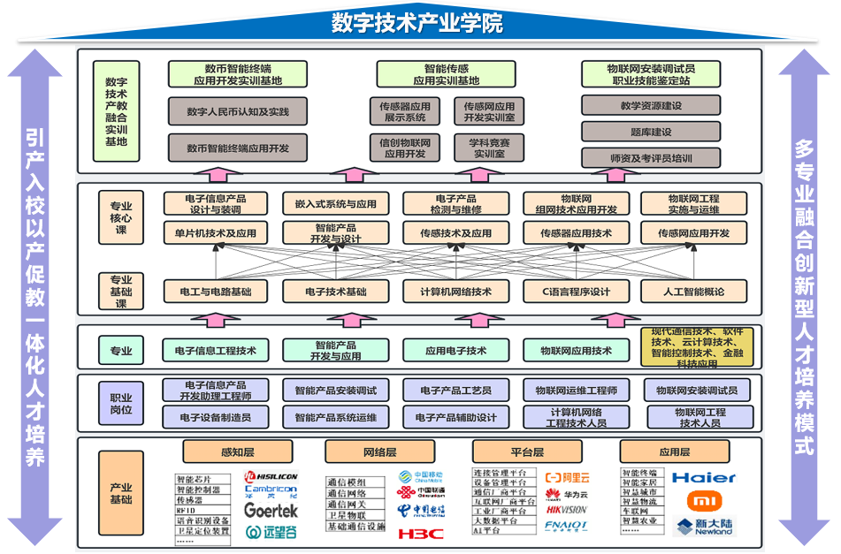 以江苏省物联网产业对人才需求为出发点,专业与新大陆共建集“人才培养、社会服务、科技创新”三位一体的数字技术产业学院,依托数字技术产教融合实训基地,营造满足“专业建设、课程教学、岗位实践、技能竞赛、工程师认证”的产教融合中心,服务于专业建设。