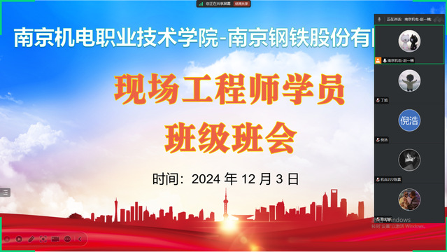 12月4日下午,校团委书记孙晓燕、机械工程系关工委副主任毛奇、现场工程师班主任赵一楠共同前往南京钢铁集团(以下简称“南钢”),针对现场工程师班级学员开展座谈。此次座谈,不仅承载着对学员们一年辛勤付出的肯定,更寄托了学校对学员们未来成长的美好期许。班级也提前一天开展线上班会介绍校团委赴南钢座谈相关事项。