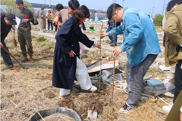 活动开始,在现场经验丰富的植树师傅的指导与带领下,师生们迅速投入到植树活动中。植树师傅手持锄头,一边耐心讲解,一边熟练示范挖坑的深度与宽度标准,“这坑啊,得挖得足够深,让树苗的根系有舒展的空间,土也要松,利于扎根。”两系师生们围在老师傅身旁,目不转睛地盯着每一个动作,不时提出疑问。随后,师生们依照教导,迅速行动起来。两系师生组织10个小组,分工明确,老师们丈量间距,精准确定每一棵树苗的种植位置,为后续工作筑牢根基;同学们则撸起袖子,双手紧握铁锹,凭借着年轻的活力与冲劲,有力地挥动着工具,高效地挖掘出一个个标准的树坑,现场尘土飞扬,却丝毫未减大家的热情。在填土过程中,还不时用脚轻轻踩实,确保树苗稳稳扎根,接着浇水灌溉,让每一棵树苗都能喝饱水,在这片土地上开启新的生命旅程。