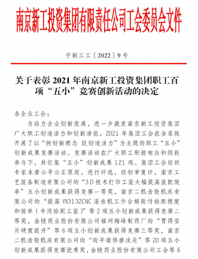5月20日上午,新工集团工会组织召开了主题为“砥砺奋进十年路,同心喜迎二十大”的表彰活动。学校工会荣获2021年度“先进基层工会组织”荣誉称号;学校蓝岛创客中心王国珍主任的《自动化高效清洁机》项目荣获2021年新工集团职工百项“五小”竞赛创新成果优秀奖;我校毕业生吕明(现任职南京汽轮电机(集团)有限责任公司)荣获“南京市五一劳动奖章”。