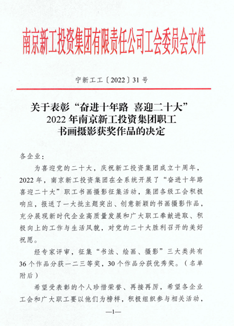 据了解,为喜迎党的二十大,庆祝新工投资集团成立十周年,南京新工投资集团在全系统开展了职工书画摄影征集活动。学校接到通知后,高度重视、精心组织、细心甄选,在活动组织的过程中得到了各分工会的大力支持。此次新工集团工会共评选出书法类作品一等奖2名、二等奖4名、三等奖6名、优秀奖13名。