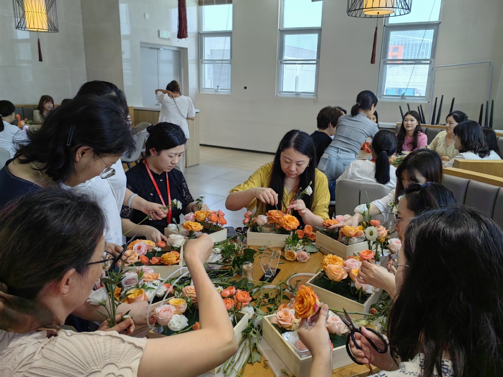 活动现场热闹非凡,欢声笑语不断。教职工们齐聚一堂,在花艺师和糕点师的指导下开始创作。桌上摆满了制作月饼的食材和鲜艳的花朵,散发着诱人的香气。大家一边认真地揉面团、包馅料,将对团圆的期盼融入每一个月饼之中;一边精心搭配鲜花,用花艺展现对美好生活的向往。