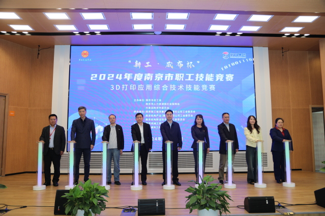 为加强和壮大南京市高技能人才队伍,为推动新质生产力的形成和发展提供人才支撑,10月29日,由南京市总工会、南京市人力资源和社会保障局、共青团南京市委员会共同主办,南京新工投资集团有限责任公司、南京机电产业(集团)有限公司与江南网页版承办,南京机械工程学会、南京威布三维科技有限公司协办的2024年度南京市职工技能大赛“新工•威布杯”3D打印应用综合技术技能竞赛在我校顺利举行,来自全市8家企事业单位选拔的50名选手参加了本次竞赛。南京市总工会党组成员、副主席赵正轶,南京新工投资集团副总经理、工会主席陈翀,南京新工投资集团工会常务副主席秦燕,南京市产业工人创新发展中心主任王敏,南京机电产业集团副总经理、总会计师刘光辉,南京机械工程学会执行理事长卢北宁,江南网页版党委书记、校长周庆礼,南京威布三维科技有限公司总经理周海鹏等相关领导参加开幕式。