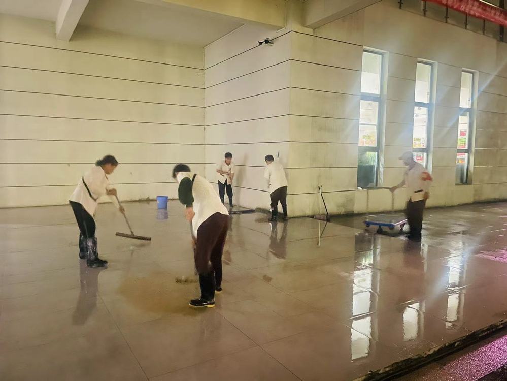 同时,南机电第四届美食节也火热开幕。尽管天公不作美,大雨不断,但却浇灭不了认真负责的保障之心。走廊上的积水、脚边的白色垃圾、地面上的油污,保洁阿姨一趟又一趟地奔波,保障了校园环境的舒适干净与整洁。