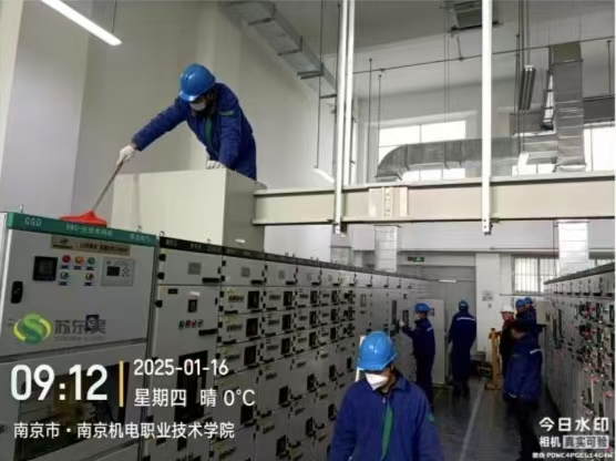 假期间工程组配合三电公司,对全校配电房进行了停电深度维护保养和预防性测试,仔细检查设备中的材料老化问题,通过试验检查隐藏的缺陷,及时更换故障零件,确保新学期的正常供电。