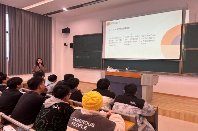 图为韦星屿老师正在讲授“仿生设计”,“授课过程中将课程思政融入课程内容,强调了文化自信的重要性和影响力。老师与学生之间的良好互动,使得学生兴趣浓厚,积极参与课堂讨论。并采用多种教学手段,如动画、视频等,使课程内容丰富、生动有趣,学生们在轻松愉快的氛围中学习,取得了良好的效果。”听课老师如是评价。