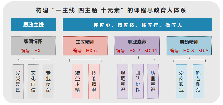 课程团队依据学院课程思政 “二十条”,紧密结合课程特点与学生学情,创新性构建了 “一主线、四主题、十元素” 的课程思政育人体系。以“怀匠心、精匠技、践匠行、做匠人” 为思政主线,串联起 “爱国情怀、工匠精神、职业素养、劳动精神” 四大主题。这四大主题对应十个思政元素,精准锚定了课程思政的育人目标。